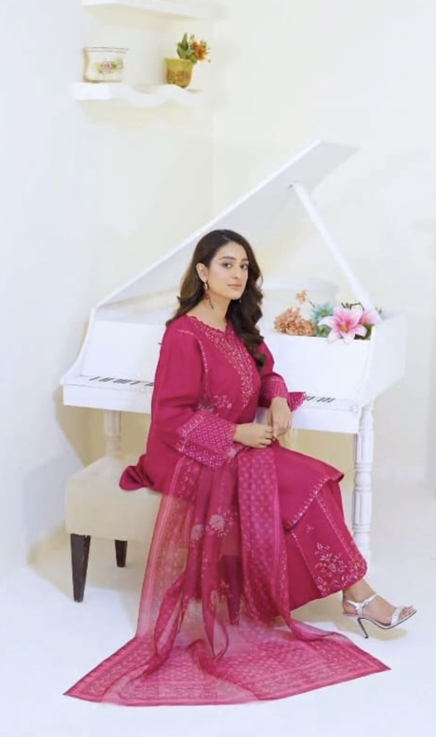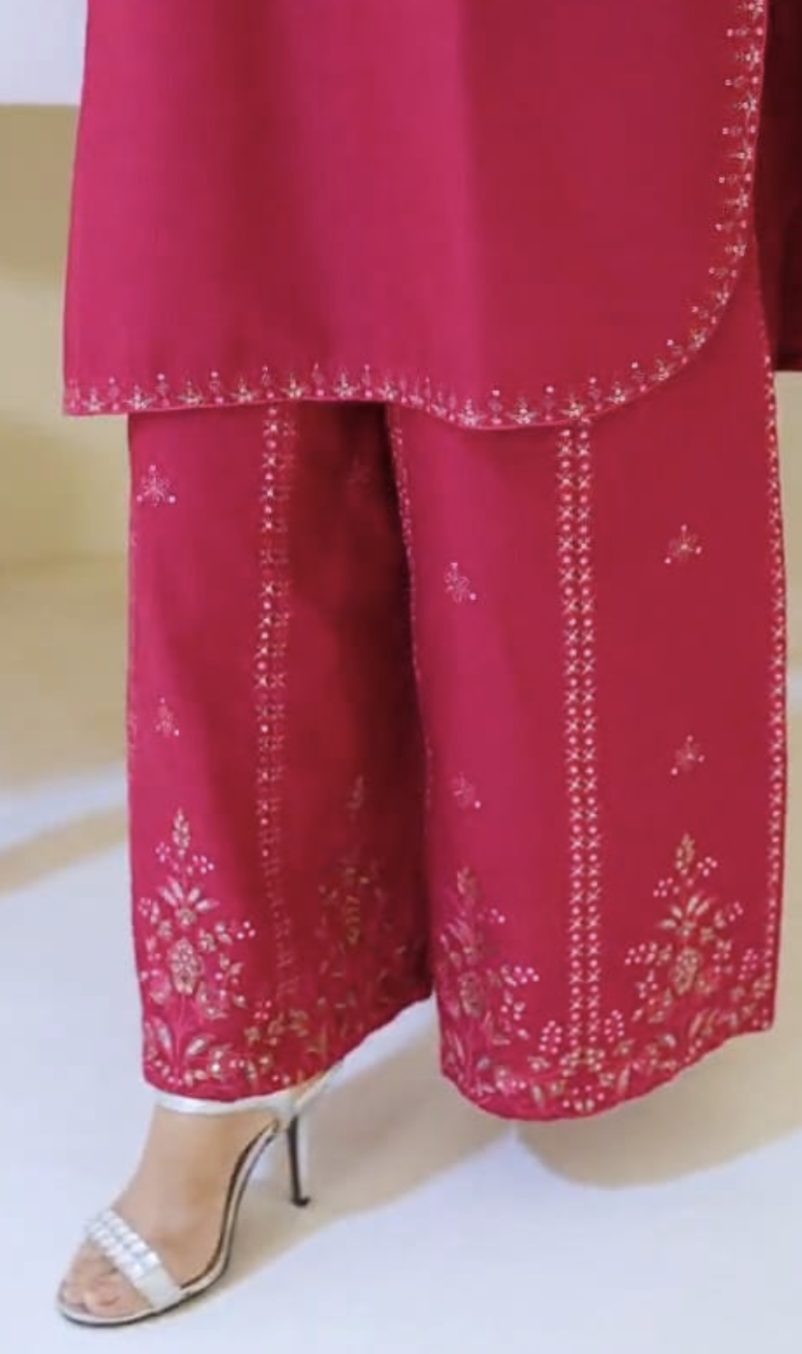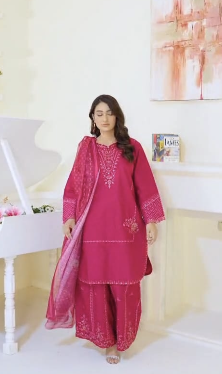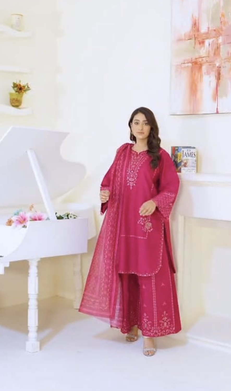 Bring refined elegance to your winter wardrobe with CT‑03, a beautifully designed 3‑piece embroidered suit from the Humayun Abbottabad Winter Collection. Styled in a rich and vibrant magenta-pink shade, this outfit adds warmth, charm, and a standout feminine touch — perfect for the winter season.
