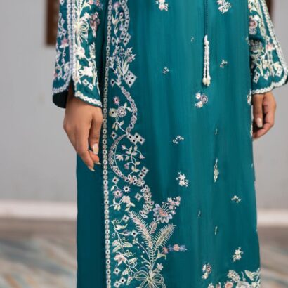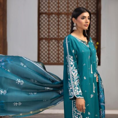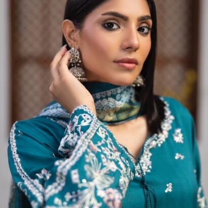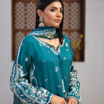 A sophisticated teal blue embroidered viscose suit, beautifully enhanced with intricate threadwork and paired with a delicately embroidered chiffon dupatta — perfect for graceful winter style.