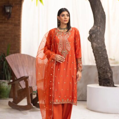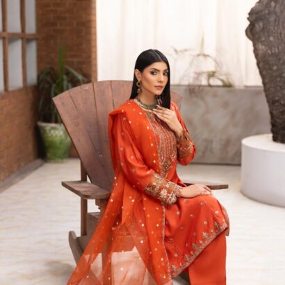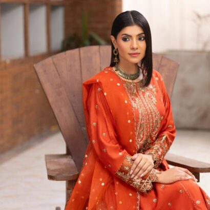 Make a bold yet graceful statement with HL-608, a captivating 3-piece embroidered viscose suit from the Hamayun Abbottabad Winter Luxury Collection. The deep burnt orange hue radiates warmth and festivity, while intricate embroidery in golden and pink tones adorns the neckline, sleeves, and borders with fine craftsmanship.