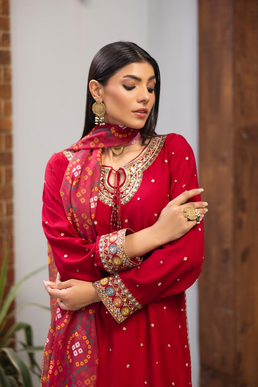 HL-605 | Ruby Red Embroidered Viscose Suit – Winter Festive Edition